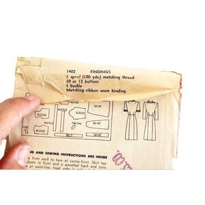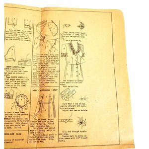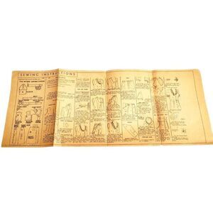 Complete with envelope packet, instructions, and 13 delicate factory-folded tissue paper pattern pieces. There is no printing on the tissue paper pieces, but they have round perforations. Everything is intact though the envelope is ripped on the sides. Instruction pages are yellowed with age.