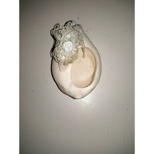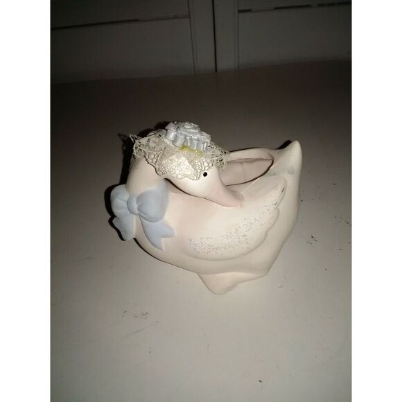 Ceramic Duck Planter With Blue Bow around the neck. She is also wearing a floral doily hat. Blue and brown painted specks to represent the wings. Great condition. No chips or cracks.