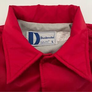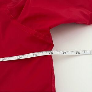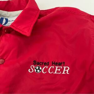 Red button down collared track jacket / windbreaker. Drawstring waist, ribbed cuffs, and ‘SHJ Vikings’ embroidered on one side, and ‘Sacred Heart Soccer’ on the other.