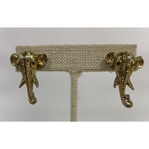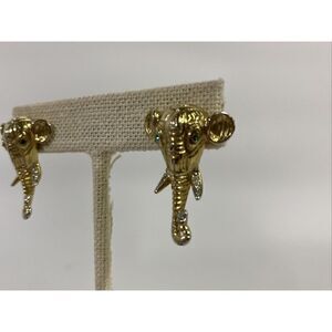 Vintage Elephant Pierced Earrings Rhinestone Gold Faux Emerald Eyes and rhinestones on trunk and tusks