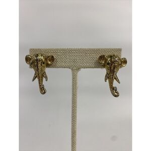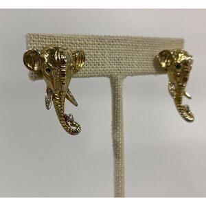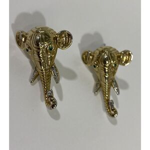 Vintage Elephant Pierced Earrings Rhinestone Gold Faux Emerald Eyes