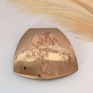 Vintage 1940’s mid century Elgin American gold toned vanity powder compact with an etched flower and leaf design. Has interior mirror and includes original powder puff. Back side exterior has some wear.
