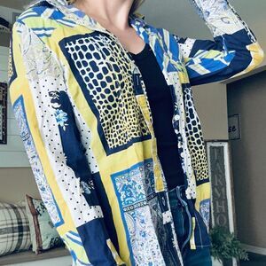 In good gently used condition. This one is super cool! I love the bright yellows and purples and all of the funky mixed prints! Animal print, polka dots, paisley! So fun and unique! Size 12