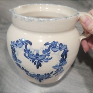Vintage Ellis Prod. Pottery Water Pitcher, floral blue heart on one side. great for water, tea, lemonade, decor or flower vase for a Farmhouse Cottage feel. No chips or cracks and will be carefully packaged for shipping.