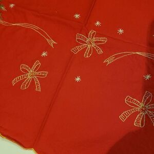 Vintage red cotton table cloth with scalloped edges floral embroidery. No holes or flaws that i can find. 30.5" X 30.5" in size