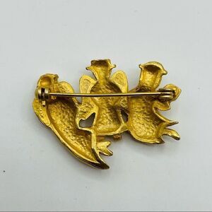 This cute pin is gold, but the angels are painted in pink and white enamel. It kind of has a cool abstract look to it. It’s approximately 1 1/2” across. It is unmarked.