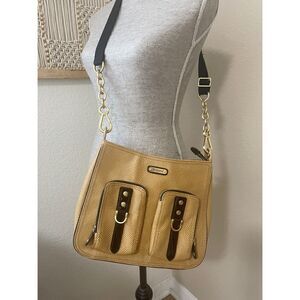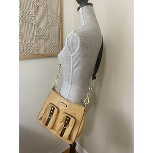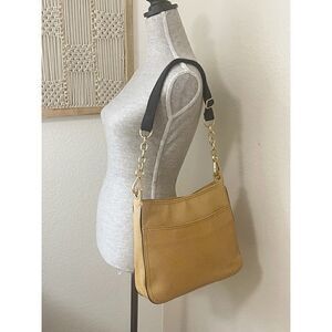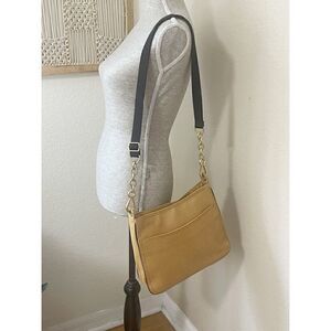 A unique find! So New York, Sex in the City style! A classic piece with embossed leather, patent leather detail, gold chain and gold hardware. The strap is half chain and half cotton and adjustable to be a crossbody or shoulder length. The inside lining is nylon so clean up well, with one zippered pocket and two slide in pouches. Two outside pockets. Strap 19” long, width 11”, length 9.5”. Excellent vintage condition.
