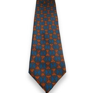 This great vintage silk tie is in excellent condition. It is teal blue with orange and army green triangles and circles. It’s 100% Silk. It’s approximately 62” long.