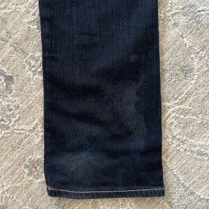Low rise, straight leg jeans from Express, size 0. Good preworn condition with wear noted throughout, and faded areas noted to back hem, with staining/faded areas noted to back right leg.