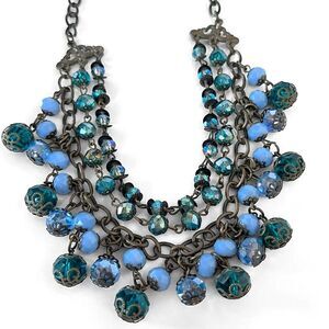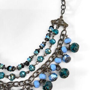 Blue and green faceted crystal glass beads on an oxidized chain with decorative metal filigree accents, triple layered bib statement necklace, lobster clasp closure. 20” length