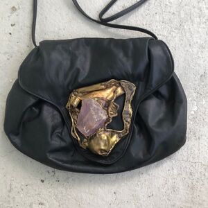 This leather bag is unique like all of fancy Nancy’s bags. Large stone is in amethyst. Signed. Measures approximately 11.5 x 8.5 drop drop is 23.