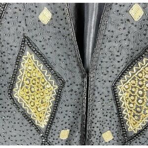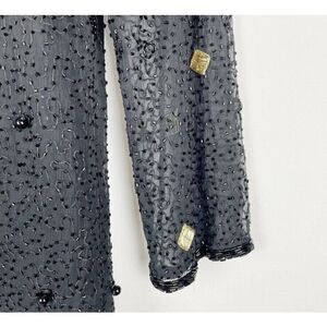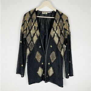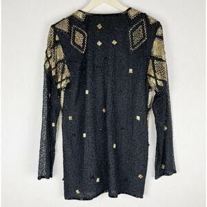 Vintage Fashion Creation Silk Black And Gold Beaded Long Sleeved Cardigan Blouse. Size 6. Gently used vintage condition. Pit to pit approximately 19”, length approximately 29”, sleeve length approximately 24”. 100% silk.