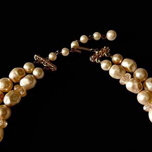 Double strand, faux baroque pearls and faux crystal beads, gold tone accents. 16” length