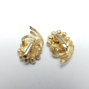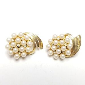 Vintage Faux Pearl Cluster Rhinestone Clip On Earrings, Retro Design, Gold Tone