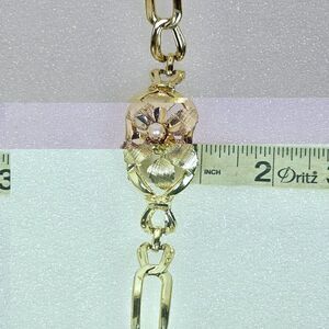 This Vintage Faux Pearl Pansy Flower Floral Gold Tone Textured Link Bracelet is a charming piece of jewelry perfect for various occasions. The retro cuff style bracelet features a delicate floral design with with a white faux pearl set in a gold tone textured & smooth metal, exuding beauty and elegance. Fit's up to a size 7" wrist on bracelet mandrel, this original vintage piece is a timeless fashion accessory that adds a touch of bohemian flair to any outfit. In very good pre-owned condition no flaws noted. Fold over locking clasp.