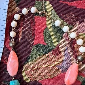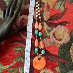 This is a well made lovely unsigned piece of costume jewelry. So summery. The necklace is 18-20 inches in length and the pendant is 2” in diameter. The beads are quality lucite/acrylic/plastic (I don’t know the differences).