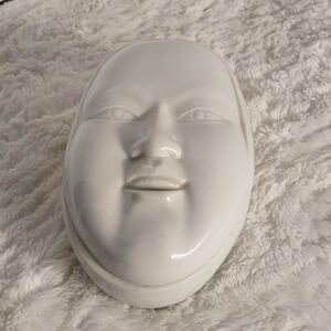 This vintage white porcelain Figural face lidded trinket box measures approximately: 2-1/2" tall x 5-1/4" x 3-1/2". No chips, cracks or repairs. In excellent preloved condition. All offers are welcome.