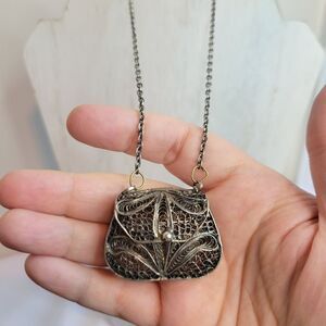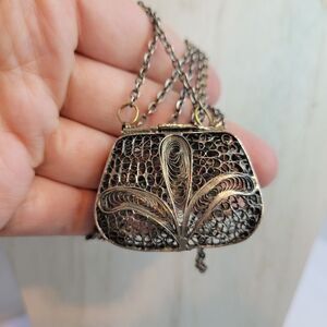 Beautiful & rare Vintage Filigree Purse Silver Tone Necklace.