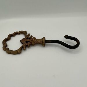 Elegant vintage fireplace damper closer with ornate design. Features a brown and black color scheme.