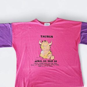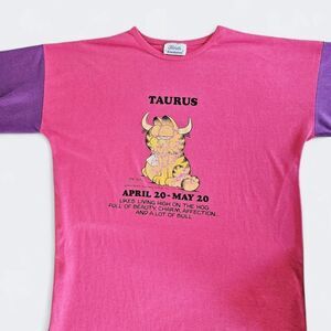 Cool vintage Garfield by Jim Davis Taurus star sign night gown/sleep shirt. This is made by Flirts by Donnkenny. It is made from an ultra soft fabric that is even softer by innumerous washes over the years. Features Garfield with bull horns for the zodiac symbol for Taurus. Reads "likes living high on the hog full of beauty, charm, affection...and lots of bull". This is such a gorgeous vintage gem. It is in very good condition considering its age. The Garfield graphic has some wash fading and there is speckle of discoloration at the shoulder.