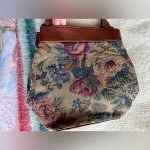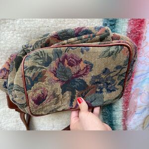 This beautiful vintage floral tapestry bag is just so beautiful, it has some signs of wear along the bottom edges as pictured but is otherwise in excellent condition. Features a front pocket. It combines leather and tapestry. In addition tot he