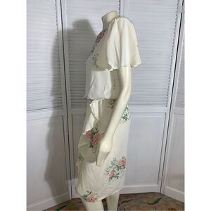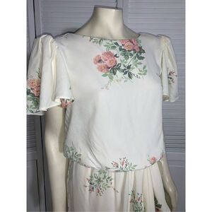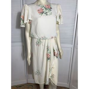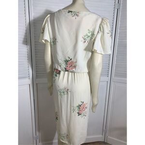 Vintage Floral Pastel Puff Sleeve Dress Cream. DAWN JOY FASHIONS pink and cream floral dress. Acetate with inner nylon cooling mesh back lining. Puckered puff flutter sleeves with mini pads. Elastic waistband with wrap bottom skirt. Great vintage condition. Extremely faint small mark back. Please see photos for condition. Mannequin size 8 for reference. Size 9/10