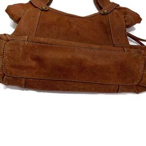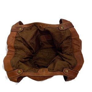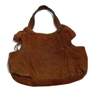 Vintage Fossil brown leather floral embossed tote with stud decoration, two open side pox, inside is fully lined with one zip pocket, two open pox and magnetic snap closure. Some wear on handles and corners (see pix). Length 17”, width 5”, depth 11” and strap drop 10”.