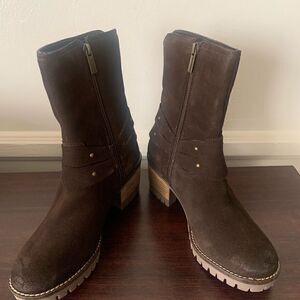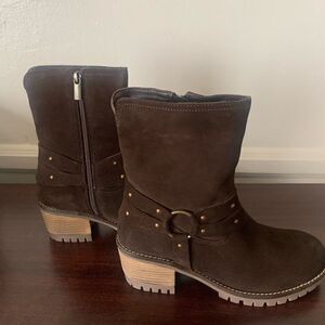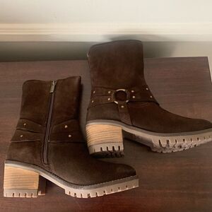 - Round toe - Distressed construction - Studded strap details - Side zip closure - Cushioned footbed - Stacked block heel - Approx. 6" shaft height, 9" opening circumference - Approx. 2.5" heel - Lug sole -