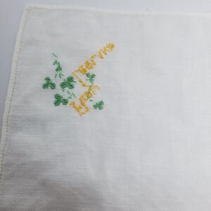 Vintage white handkerchief with green and orange embroidered From Ireland surround by clovers in one corner. Size: 9" x 9.5"