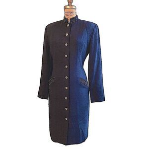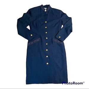 Beautifully tailored Vintage military inspired shirt dress has an embroidered mandarin collar and pocket trim that matches. Blue Fabric is a 100% wool crepe, it is fully lined and the buttons have crests on, matching button detail on the sleeves. In excellent condition