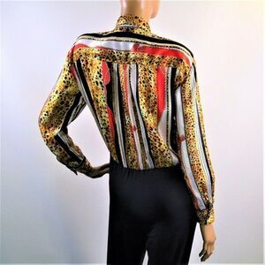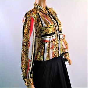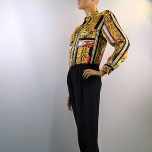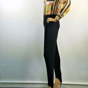 It is So 1980's ! One Piece Suit - Silky Multi Color Top With Cotton Stretch Stirrup Pants .Button Front , Shoulder Pads , Long Sleeve , Collared Blouse .Attached Black Pants - Elastic Waist , Front Pleat . Side Pockets , Ankle Strap .Made Here In USA by PG Collections And Designed By Ginger Bort. Tagged Size 6 .Measurements Laid Flat : Top - Across Bust 20" / Shoulders 19" / Sleeve 21" / Shoulder To Waist 19" .Pants - Waist ( Unstretched ) 14" / Inseam 25" / Rise 12.5" / Ankle Band 3"/ 55" Long
