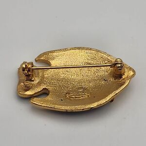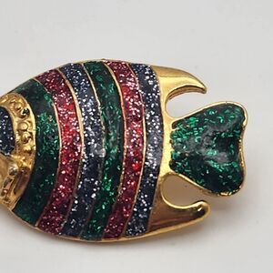 Vintage Giovanni gold tone fish brooch with green, red, and blue sparkly enamel stripes.