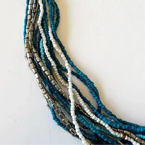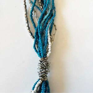 Glass bead twist necklace 30” wearable length (slightly adjustable). Shades of turquoise silver and white beads. Preowned.