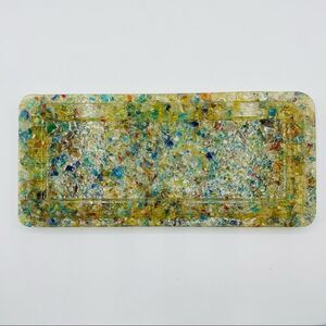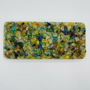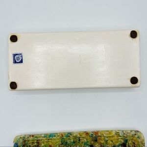This vintage glass top two key box is in excellent condition. There are no chips or cracks. The lid is made of multi colored fused glass, and the bottom is ceramic. It still has the sticker on the bottom and it was made by The Glass Shack in Kailua, Hawaii. It’s approximately 9 1/2”x4 1/2”x 1 1/2”. It’s truly an amazing one of a kind piece!