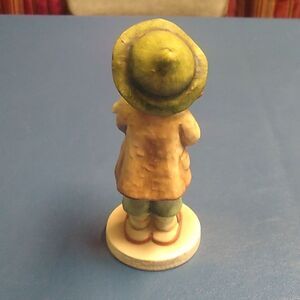 Adorable figurine of a child holding a cat. Features green hat and pants, brown shoes, and a cream base.
