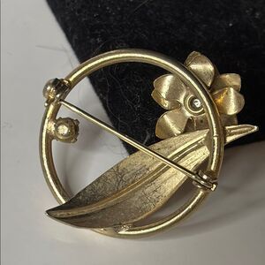 This elegant gold brooch features a delicate pearl accent, perfect for adding a touch of sophistication to any outfit. The intricate design is complemented by a sparkling crystal detail.
