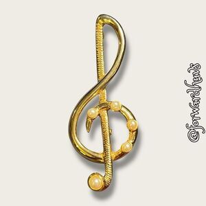 Vintage Gold Tone Treble Clef Brooch with Faux Pearls – 3”