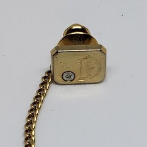Vintage gold tone letter D engraved diamond tie tac. Metal is not marked. Small stone tested as a diamond.