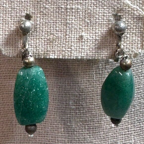 These vintage earrings feature natural green aventurine stones paired with silver-tone screw-back closures for a classic yet timeless accessory.