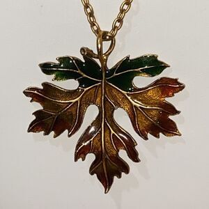 Vintage Green, Gold & Brown Enamel Maple Leaf Pendant Necklace