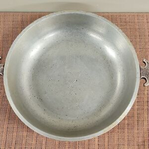 It measures about 15" across from edge of handle to edge of handle, 12 " opening, and 2" deep.