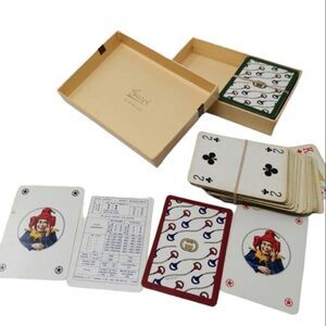 Indulge in a piece of luxury history with this rare set of vintage Gucci playing cards, featuring two decks adorned in the iconic red and green horsebit print. A bold statement of exclusivity and timeless sophistication, this set is perfect for Gucci enthusiasts and vintage collectors alike. The intricate horsebit design exudes trendiness while staying true to Gucci's heritage of bold elegance.