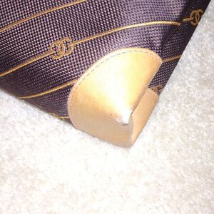 Pre-owned in good condition. Minor wear on bottom corners of the bag. Clean inside and outside. All leather and outside material in good condition. No dust bag. Measurements 10" across x 8.5" tall x 2.25" deep. Handle drop is 13" long. Outside logo hardware slightly discolored but not noticeable.