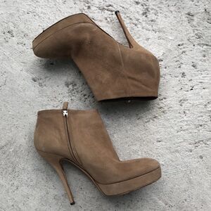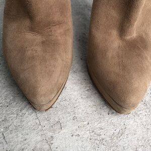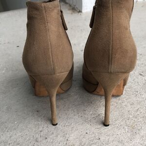 These Gucci suede platforms have been professionally cleaned and waterproofed. They are leather lined. They have the stiletto heel which measures approximately 5 inches, platform measures 1 inch.