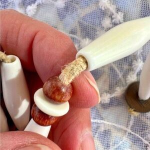 The long, creamy white Hairpipe beads are clever faux bone. I see some light graining, but these are smooth acrylic as are the matching disc beads.
