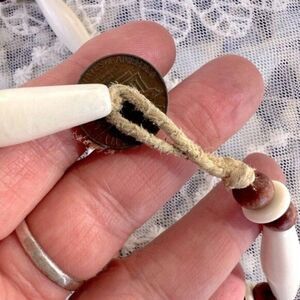 Round, cinnamon color wood beads add detail and contrast. Lightweight. 16.5 total inches. Strung on rough fiber cord - now aged. Quite cool actually - love that genuine penny!