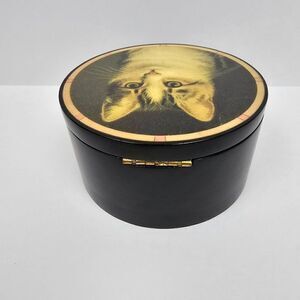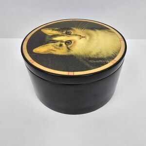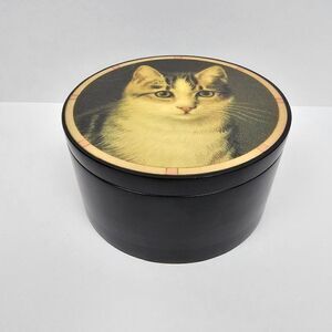 Offering for your consideration is this beautiful 1980's Vintage Black Lacquered Round Wind Up Music Trinket Box From the Hallmark Historical Collection with an Adorable Cat Posing on the Hinged Lid. I'm Not Sure of the Tune It's Playing But Plays As It's Intended As Can Be Seen In The Video with Volume On . There Is A Small Inner Area Lined with Black Velvet for Storing Some Small Jewelry Items Such As A Wedding Ring Set or Your Favorite Pair of Earrings. On The Bottom of the Wooden Base It Turns to the Right for On and the Left For Off & Winds & Plays When Lid is Open Or Closed. It Measures Approximately 4 1/2" in Diameter x 2 1/2" Tall & Is In Very Good Condition with a Few Minor Chips As Can Be Seen In Photos. The Original Hallmark Cards Historical Collection Sticker on the Base Has Been Removed.