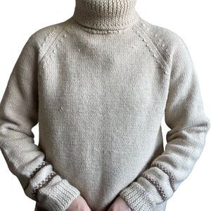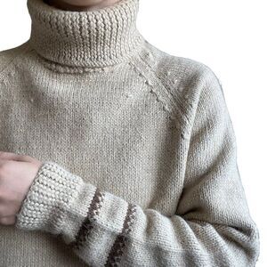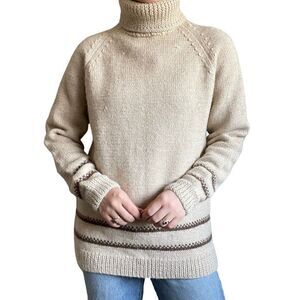 Vintage Hand Knit Alpaca Beige Tan Turtleneck Striped Minimalist Sweater Sz XL