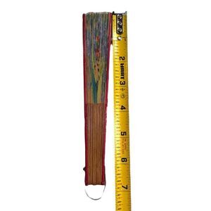 A beautifully hand-painted folding fan featuring vibrant floral and landscape motifs. Crafted with wood and fabric, it is lightweight and visually appealing.
