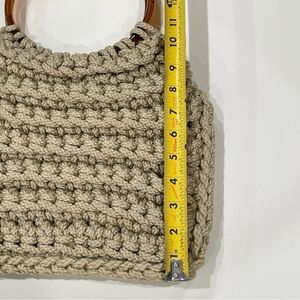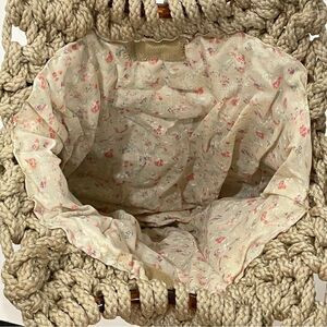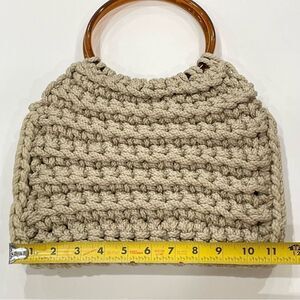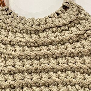Beautiful tan (with a slight shinmer) handmade vintage crocheted bag with circular brown tortoise shell like handles, lined and has velcro closure. In excellent pre-owned condition.